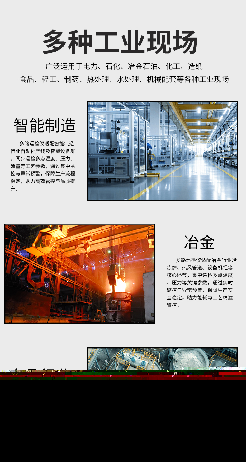 虹潤公司是專業(yè)生產多路溫度巡檢儀的國家專精特新“小巨人”企業(yè),生產的多回路測量顯示控制儀,具有8路/16路測量通道,全切換信號輸入,多種輸出類型,高抗干擾,RS485/RS232通訊等特點。產品獲得巡回檢測顯示方法及裝置、儀表殼體等2項國家發(fā)明專利,主持起草工業(yè)過程控制系統(tǒng)用模擬輸入兩位或多位輸出儀表、物聯(lián)網智能溫度儀表通用技術條件等2項國家標準,以及通信系統(tǒng)多通道數(shù)據(jù)采集控制終端規(guī)范軍用標準,參與國際5G標準制定,取得多回路測量顯示控制儀等3項相關軟件著作權。產品廣泛應用于電力、石化、冶金、制藥、水處理、機械配套等各種工業(yè)現(xiàn)場。