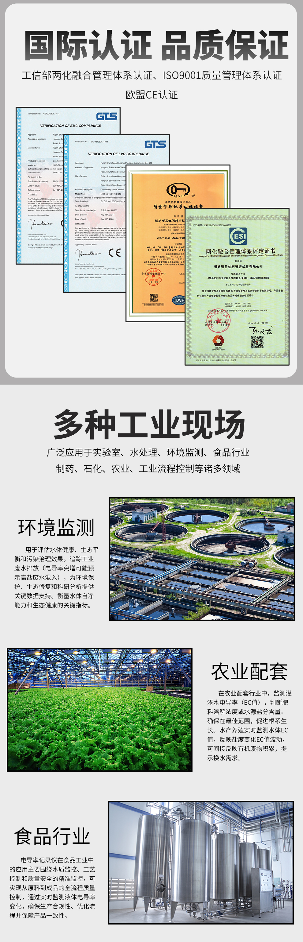 虹潤公司是專業(yè)生產(chǎn)水質(zhì)分析儀的國家專精特新“小巨人”企業(yè)。生產(chǎn)的電導(dǎo)率記錄儀,具有模擬電極與數(shù)字電極切換輸入、測量精準穩(wěn)定不跳字,數(shù)據(jù)記錄與轉(zhuǎn)存、RS485/以太網(wǎng)通訊,配套上位機管理軟件等特點。產(chǎn)品獲得一種平板無紙記錄儀、智能化控制器等2項國家發(fā)明專利;主持起草物聯(lián)網(wǎng)智能記錄儀表通用技術(shù)條件、現(xiàn)場設(shè)備工具(FDT)接口規(guī)范.、過程分析技術(shù)系統(tǒng)等3項國家標準,以及通信系統(tǒng)多通道數(shù)據(jù)采集控制終端規(guī)范軍用標準,參與國際5G標準制定,取得電導(dǎo)率無紙記錄儀表等4項相關(guān)軟件著作權(quán)。產(chǎn)品廣泛應(yīng)用于環(huán)保水務(wù)、市政供水、水產(chǎn)養(yǎng)殖、農(nóng)業(yè)灌溉、科研實驗等諸多領(lǐng)域。